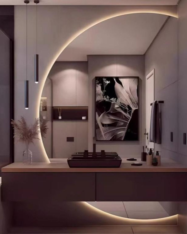 Breng stijl en functionaliteit samen met onze halve maan spiegel van Lys in twee delen met LED verlichting. Dit unieke ontwerp bestaat uit twee elegante spiegelhelften, waardoor er ruimte ontstaat voor een kastje of plank in het midden. Perfect om praktische opbergruimte te combineren met een luxe uitstraling.